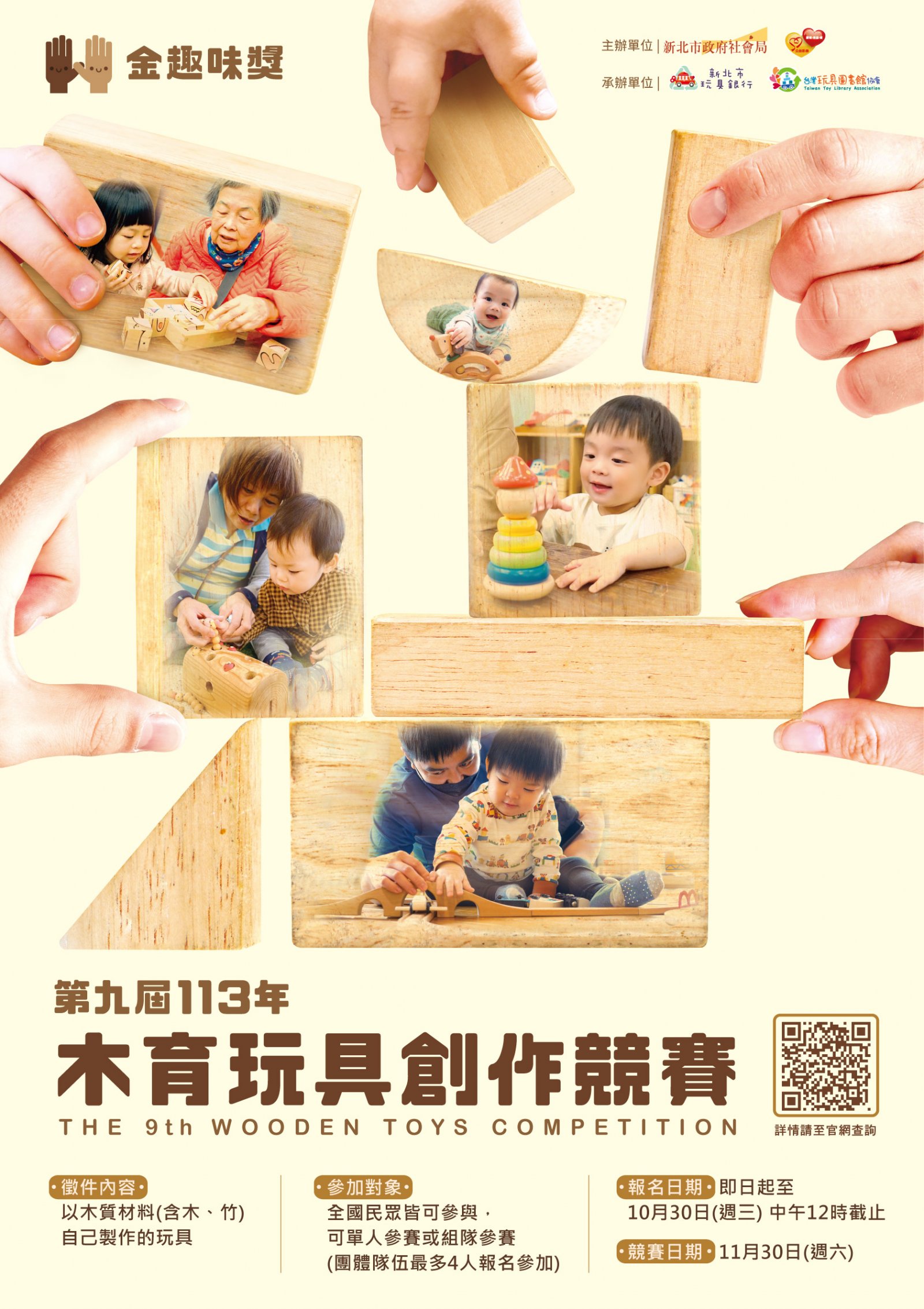 | 一、 | 本會與新北市政府社會局合作辦理《113木育玩具創作競賽-第九屆金趣咪獎》,誠摯邀請民眾參與競賽活動。 |