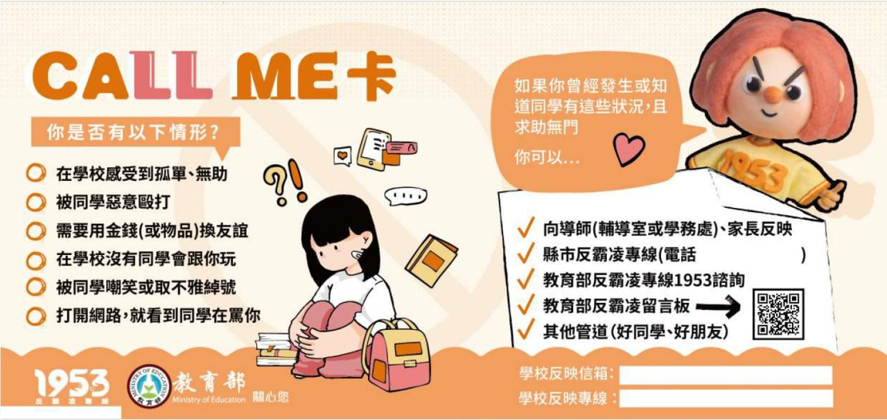 為強化校園霸凌防制宣導,教育部製作Call Me卡(如附件)。 希望讓化仁國中的校園杜絕一切形式的霸凌,共創友善校園。