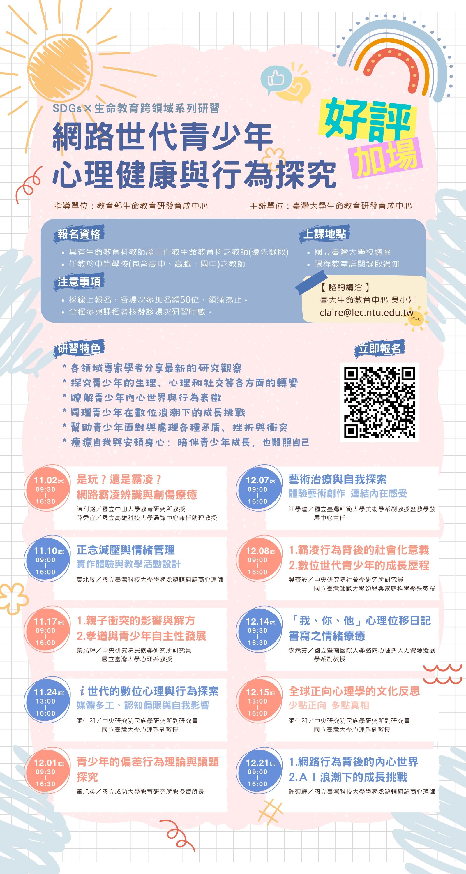 二、本研習規劃10個場次,詳細內容請參閱附件簡章及海報。