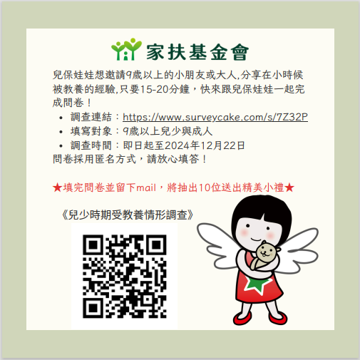三、為瞭解我國兒少受教養的情形,辦理本次調查,希冀從每個人的經驗分享中,瞭解兒童保護議題對於每個人之影響。