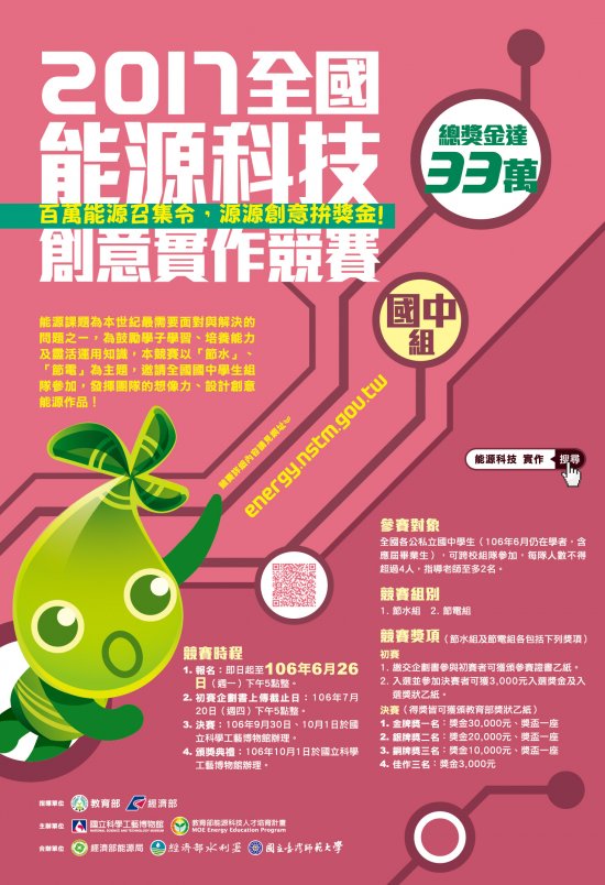 | 三、 | 本競賽限網路報名,報名時間即日起至106年06月26日下午5時止, 詳細競賽資訊請見網頁http://energy.nstm.gov.tw。 |