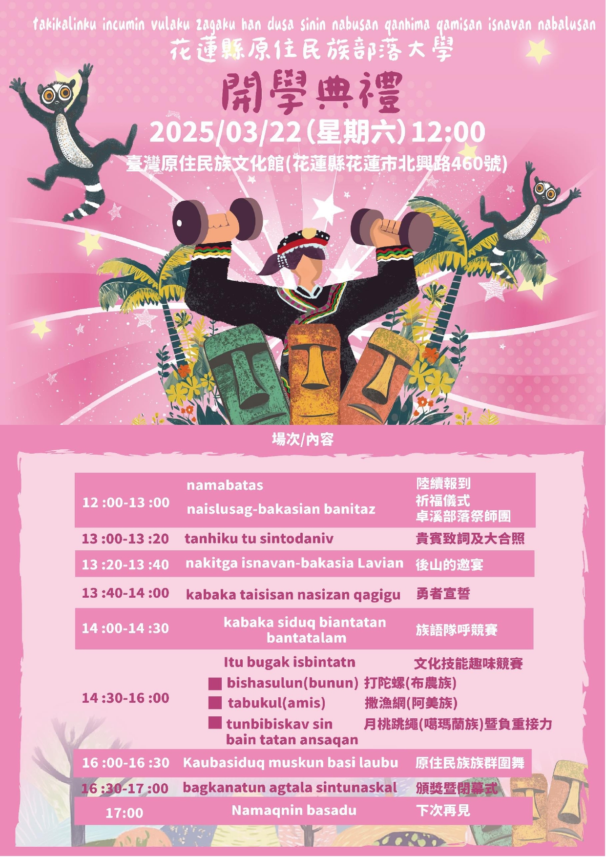 花蓮縣政府辦理「原住民族部落大學114年開學典禮:malacecayay kita 我們齊心合一」,敬邀蒞臨參加。