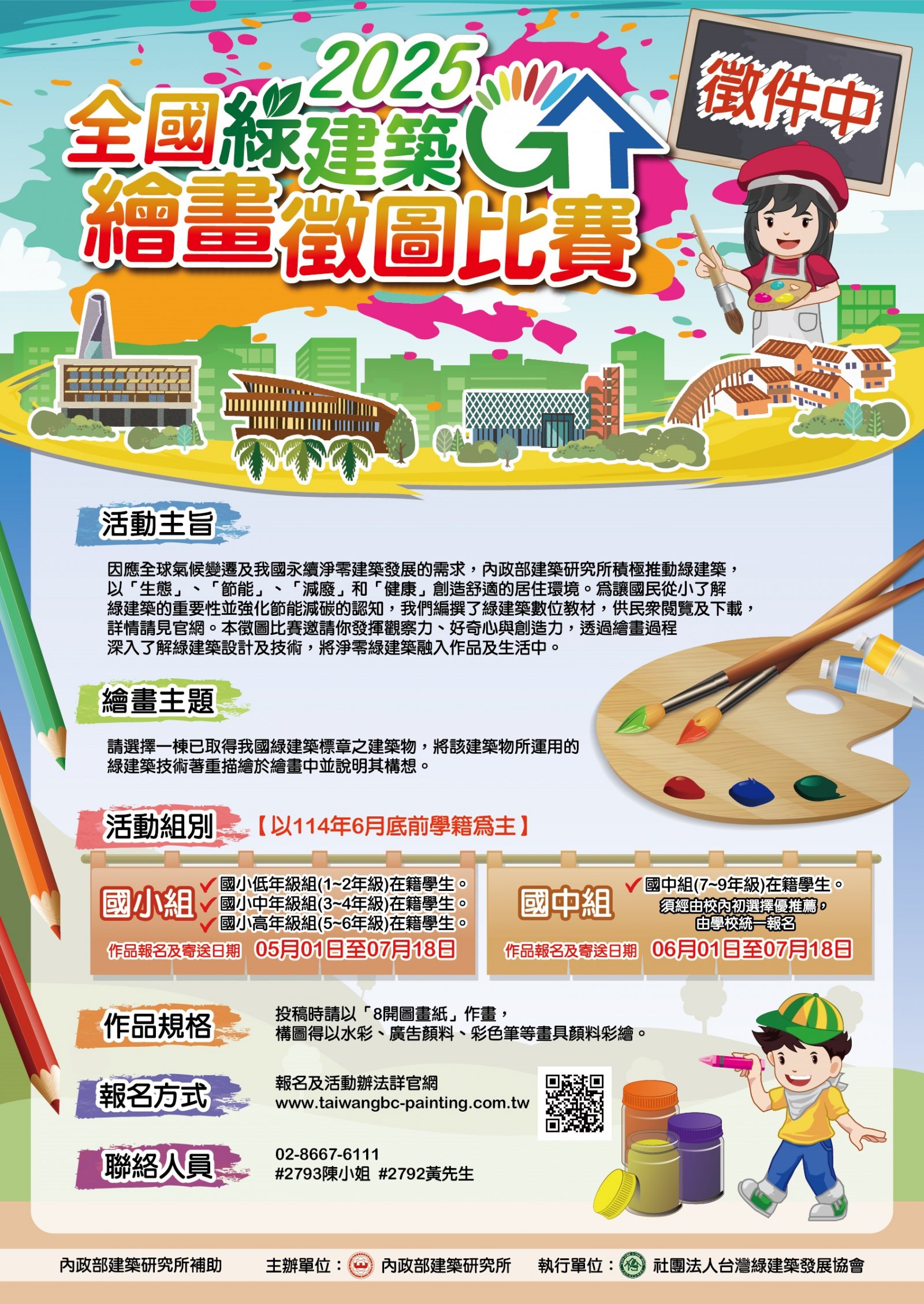 | (四) | 活動詳情與報名資訊,請至本所補助單位社團法人台灣綠建築發展協會比賽官網(http://www.taiwangbc-painting.com.tw)查詢,或撥打聯絡電話(02)8667-6111分機2793、2792洽詢。 |