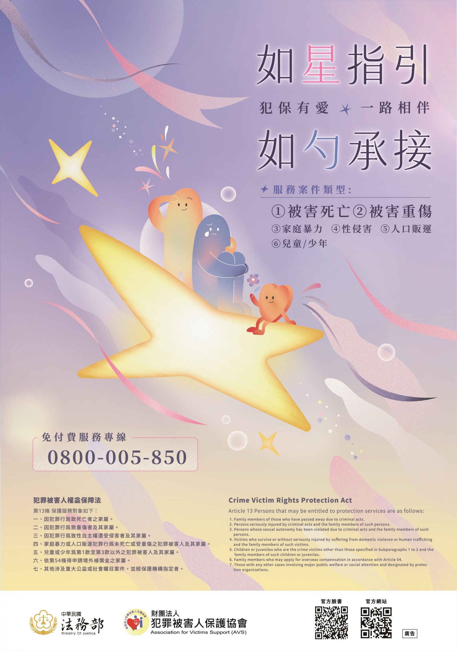 四、相關影片、海報等宣導素材均置於法務部全球資訊網「簡介/重大政策/犯罪被害人保護」頁面項下;財團法人犯罪被害人保護協會(下稱該會)亦將陸續上傳犯罪被害人權益保障業務最新宣導素材至該會網站(https://www.avs.org.tw/)「暖心出品」項下或粉絲專頁(https://www.facebook.com/avs0850),請自行運用或推廣分享。