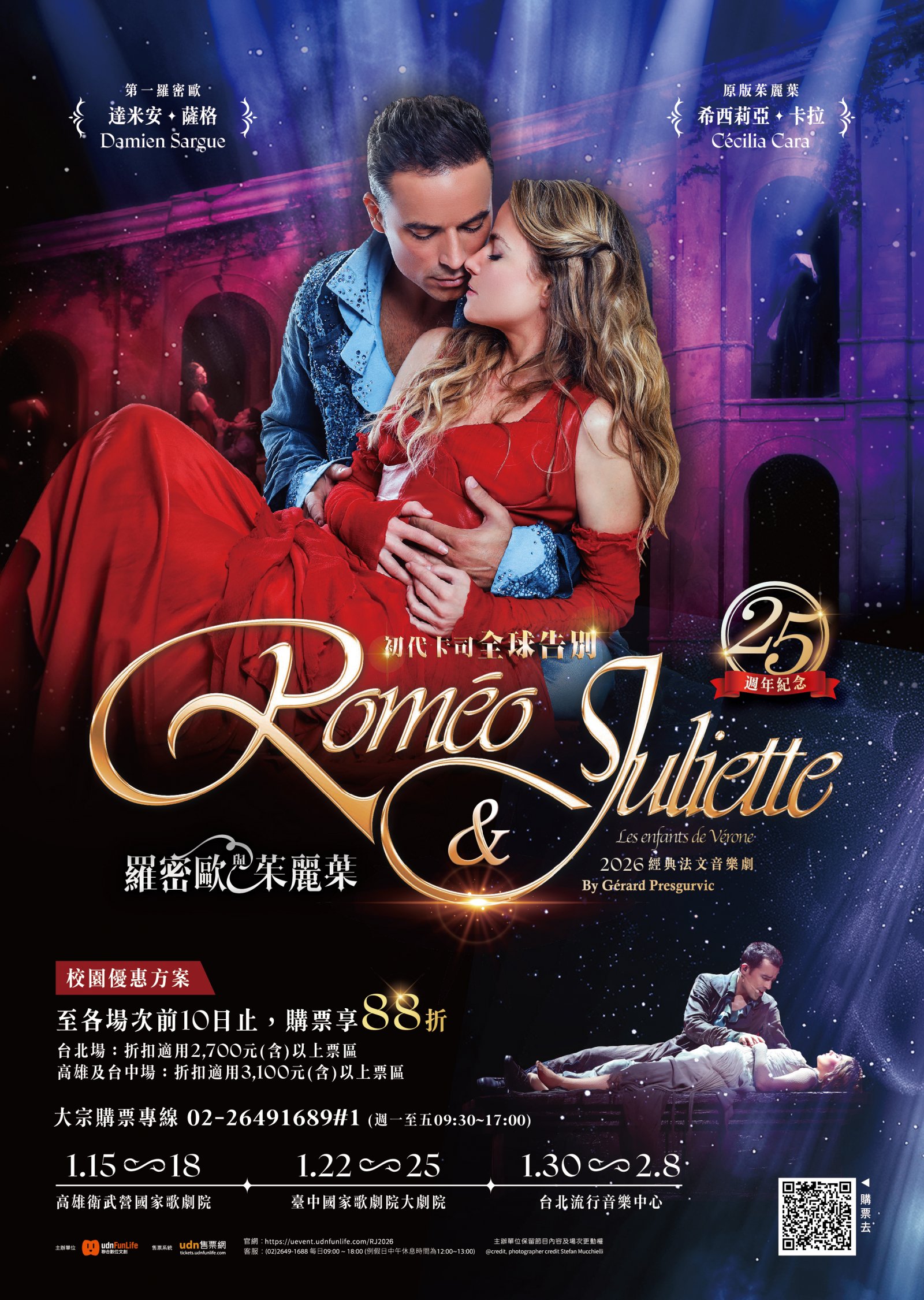 聯合數位文創股份有限公司訂於115年1月15日(週四)起至115年2月8日(週日)分別於高雄衛武營國家藝術文化中心歌劇院、台中國家歌劇院大劇院及台北流行音樂中心表演廳舉辦經典法文音樂劇《羅密歐與茱麗葉》。
