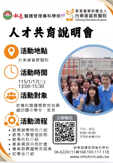 一、敏惠醫護管理專科學校與台東基督教醫院體系共同培育醫護專業人才,東基醫院提供學生助學獎金,協助學生安心就學。 二、活動時間:115年01月17日(六)下午13:00至15:30。 三、活動對象:對醫護類科有興趣之師長、國中生及家長。 四、活動地點:台東基督教醫院 (台東縣台東市開封街350號)。 五、報名網址:https://forms.gle/To9DHAeZXT4ugRq36。 六、報名時間:即日起至115年1月8日(四)止。 七、活動說明及流程,詳見附件。