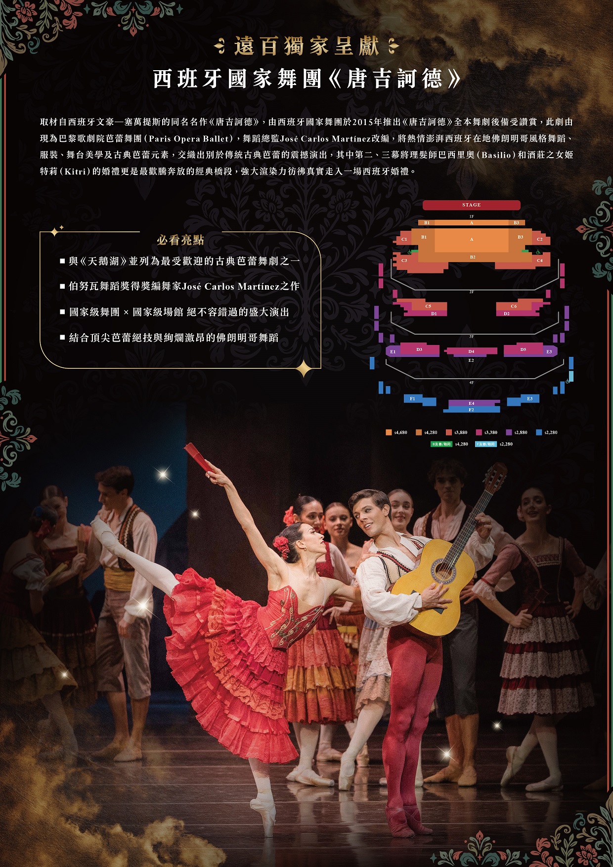 | (五) | 本次演出版本由現任巴黎歌劇院芭蕾舞團舞蹈總監、伯努瓦舞蹈獎(Benois de la Danse)得主 José Carlos Martínez 改編創作。Martínez 以19世紀「古典芭蕾之父」莫里斯.佩蒂帕(Marius Petipa)的經典版本為基礎,在尊重古典技術體系與結構框架的前提下,融入更鮮明的西班牙文化元素,使人物性格更加立體,並透過舞段節奏與場景轉換的流動設計,讓敘事更為緊湊而富層次。 |