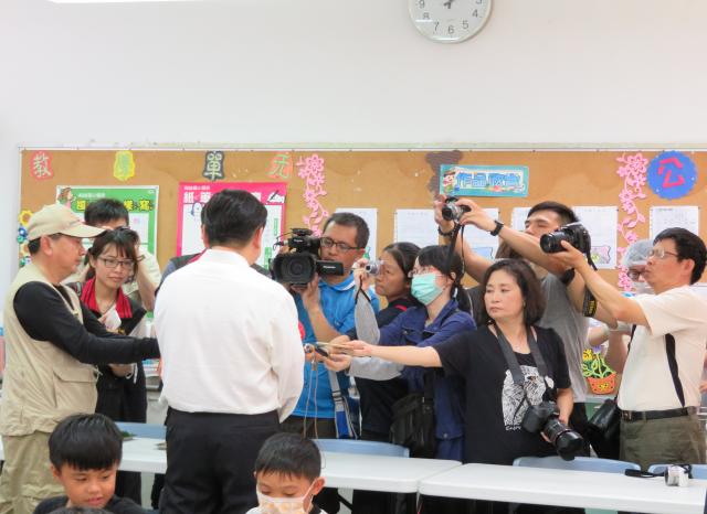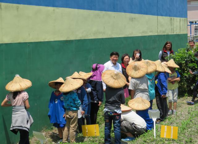 縣長蒞校訪視學校午餐食農-野菜教育。觀看野菜課程上課情形、到幼兒園與小朋友見面,並到低年級教室與小朋友共進午餐,餐後並與學校足球隊、跆拳道團小朋友一起合影留念。