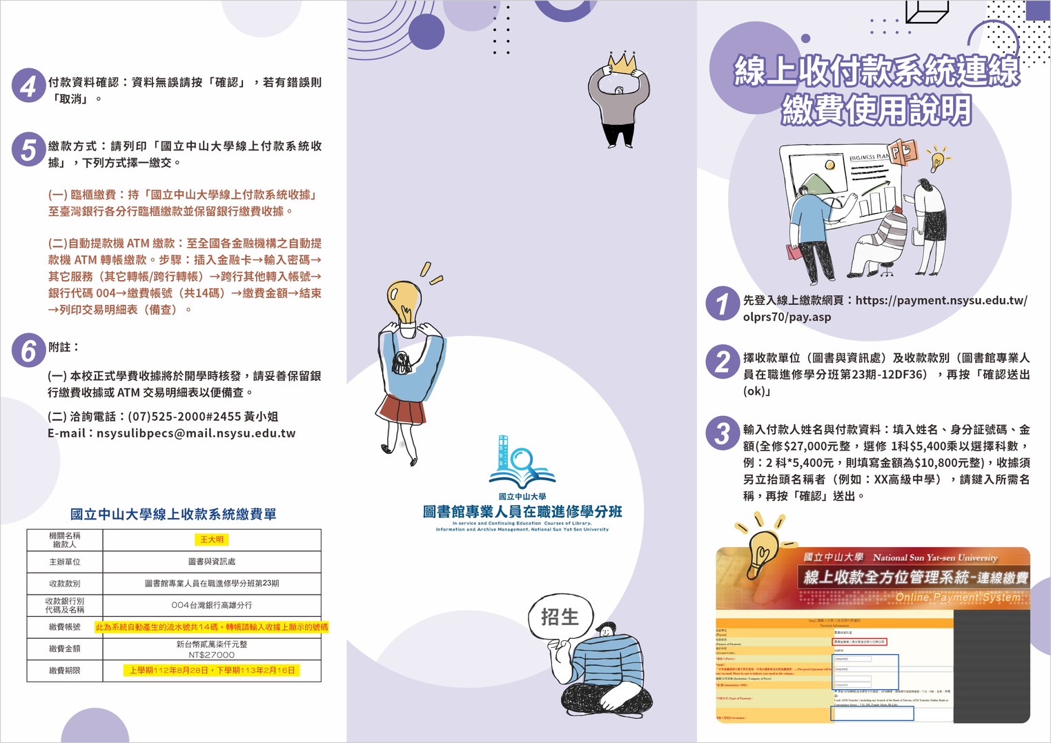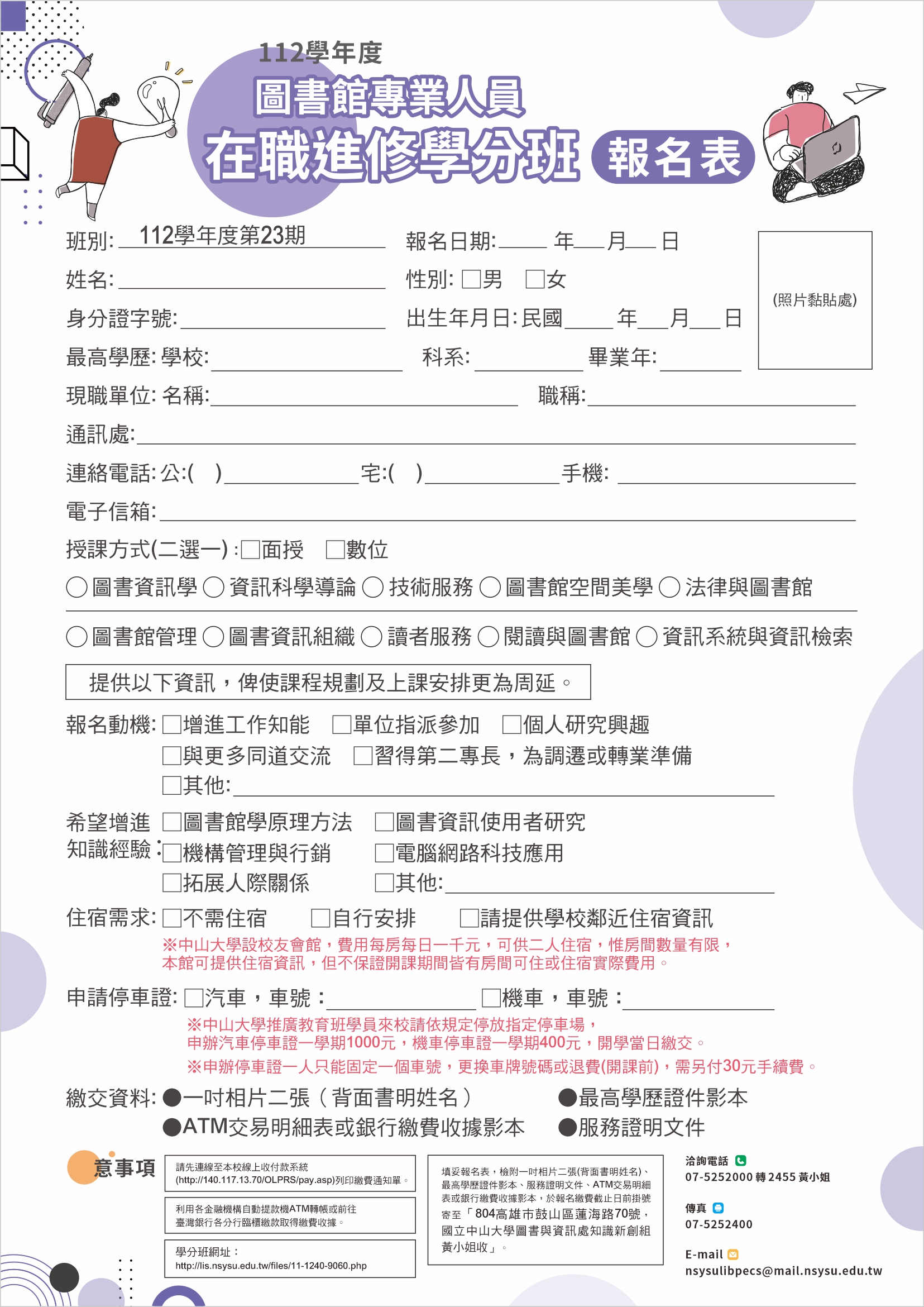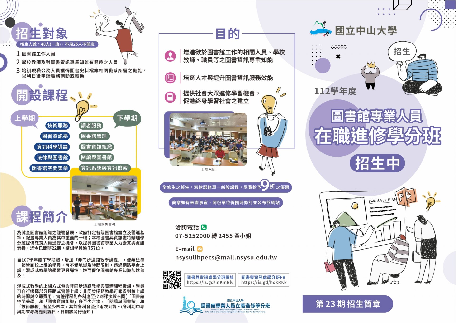 函轉國立中山大學圖書與資訊處辦理「第23期圖書館專業人員在職進修學分班」上學期招生簡章,請查照。