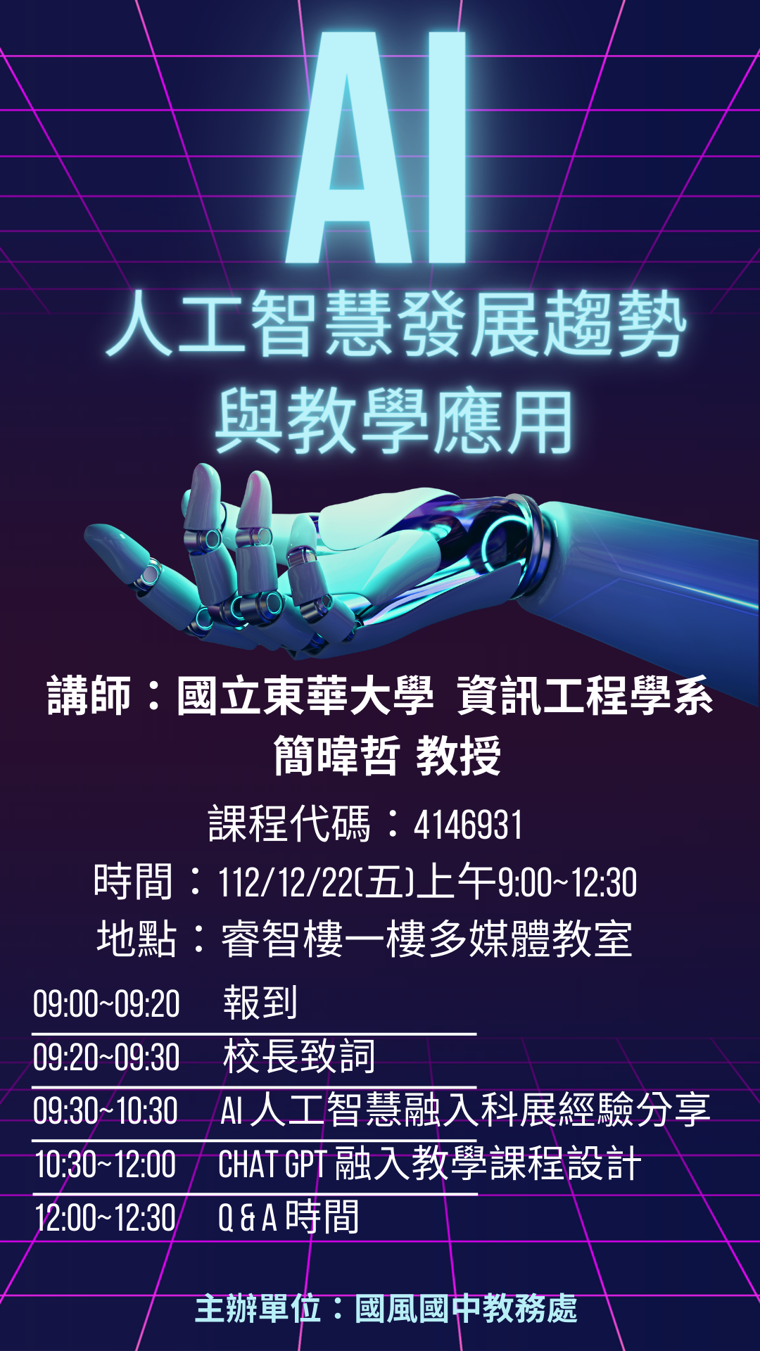 研習時間: 112 年 12 月 22 日(五) 早上 09 時 至 中午 12 時 30 分 研習地點:本校睿智樓一樓多媒體教室 報名截止:112.12.18 全國教師在職進修網(課程代碼:4146931)