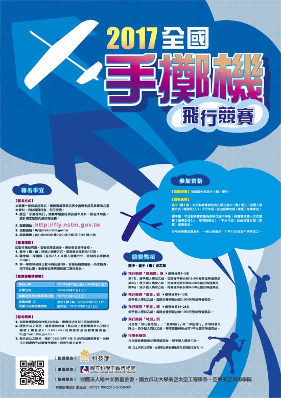 一、 106 年度本競賽訂於 12 月 16 及 17 日舉辦,邀請全國高中職及國中學生參加,競賽總獎金(或等值獎品)超過 14 萬元。 三、競賽自 9 月 22 日上午 9 時起開放網路報名,報名期間至 10 月 6 日下午 5 時止,詳細競賽規則及報名方式請見網站( http://fly.nstm.gov.tw)。