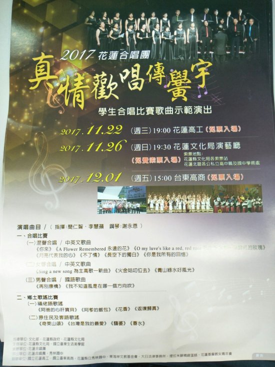 公告2017花蓮合唱團表演活動,歡迎參加!