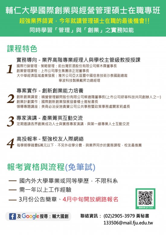 六、檢附輔仁大學「國際創業與經營管理碩士在職專班」海報(如附件)
