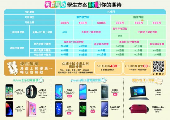 (五)出國打卡秀美圖最優惠:亞洲十國漫遊上網學生/教職員專屬優惠,免換卡,輕量型/吃到飽多種選擇,吃到飽不限速。