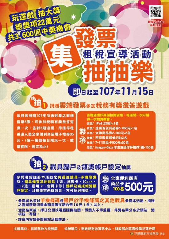 一、依據花蓮縣政府107年9月14日府稅企字第1070185266號函暨地方稅務局「107年推動以載具儲存電子發票辦理『集發票抽抽樂』租稅宣導活動實施計畫」辦理。