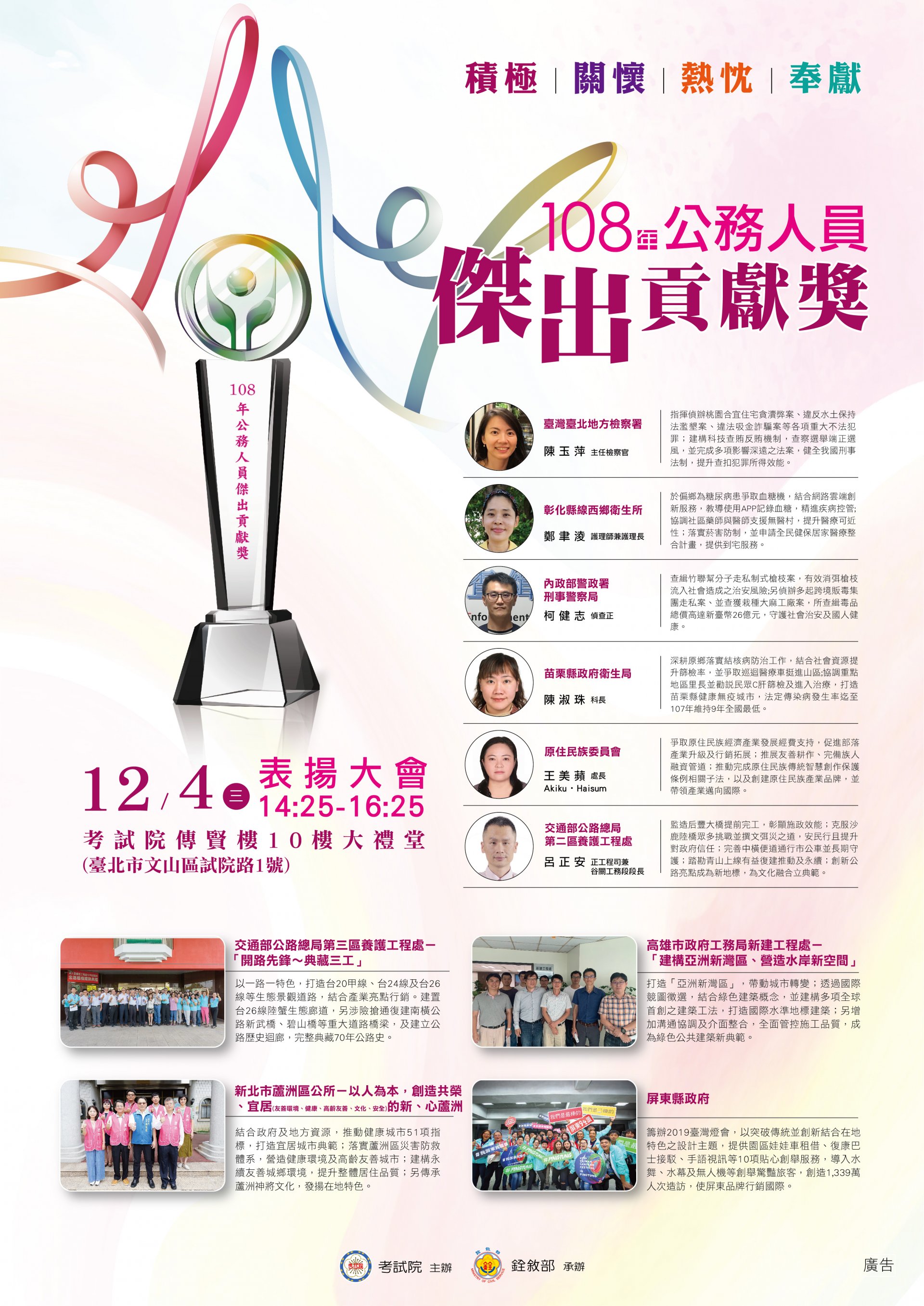 銓敘部「108年公務人員傑出貢獻獎表揚大會」海報及網路抽獎活動。