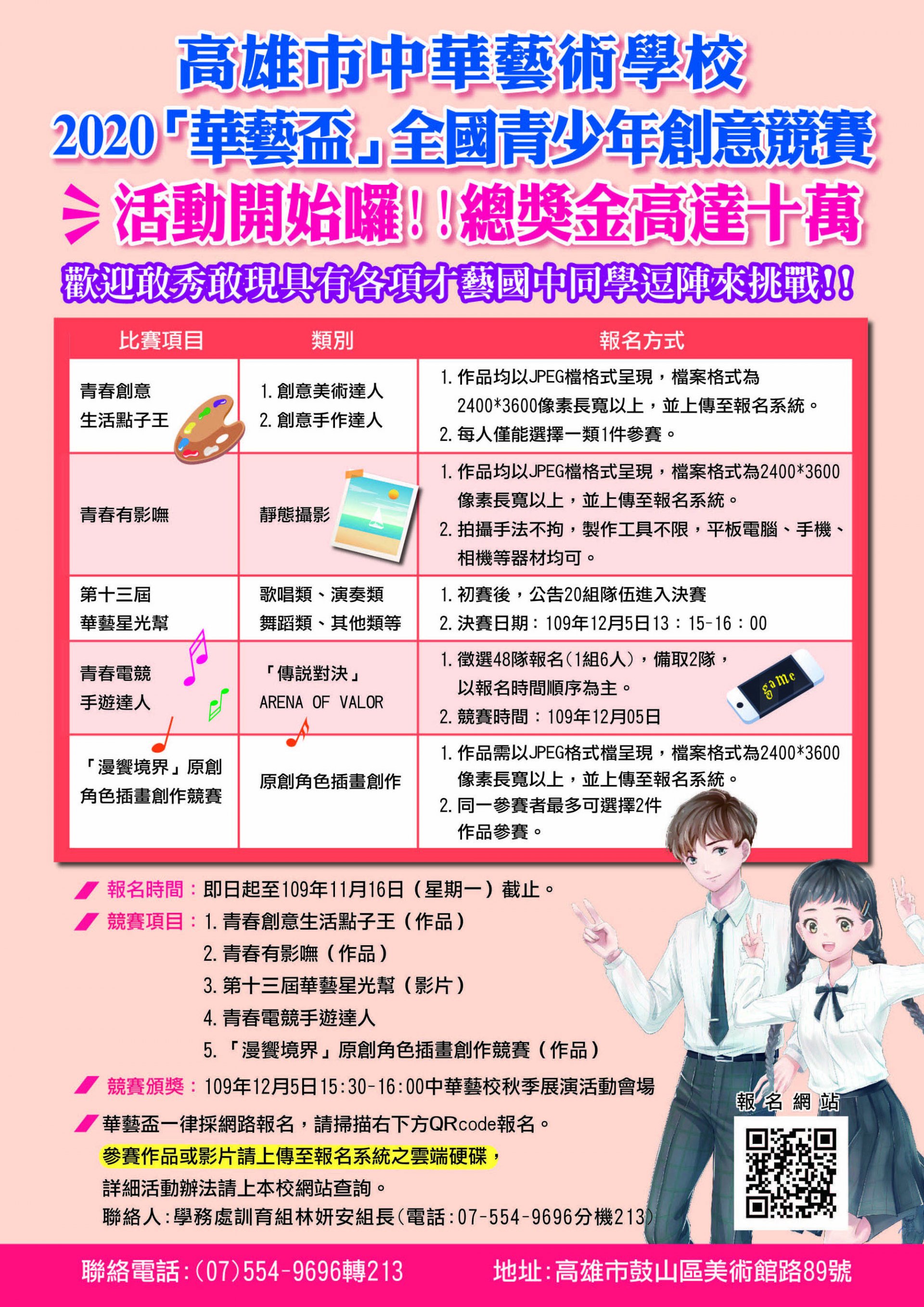 | 四、 | 檢附 2020 年「華藝盃」全國青少年創意競賽活動辦法及活動 DM 乙份,敬請協助宣導公告。 |