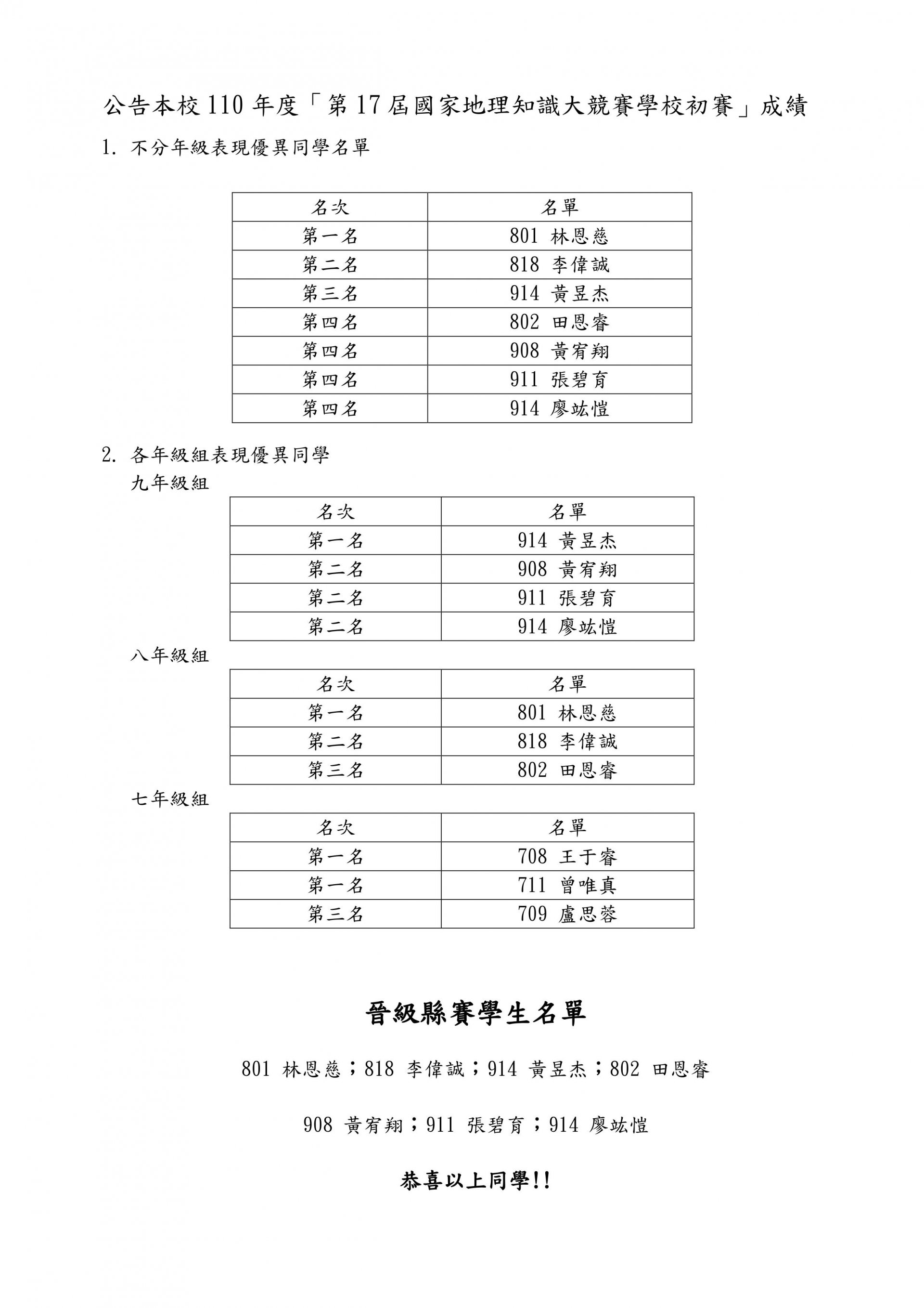 110 年度「第 17 屆國家地理知識大競賽學校初賽」成績如附件