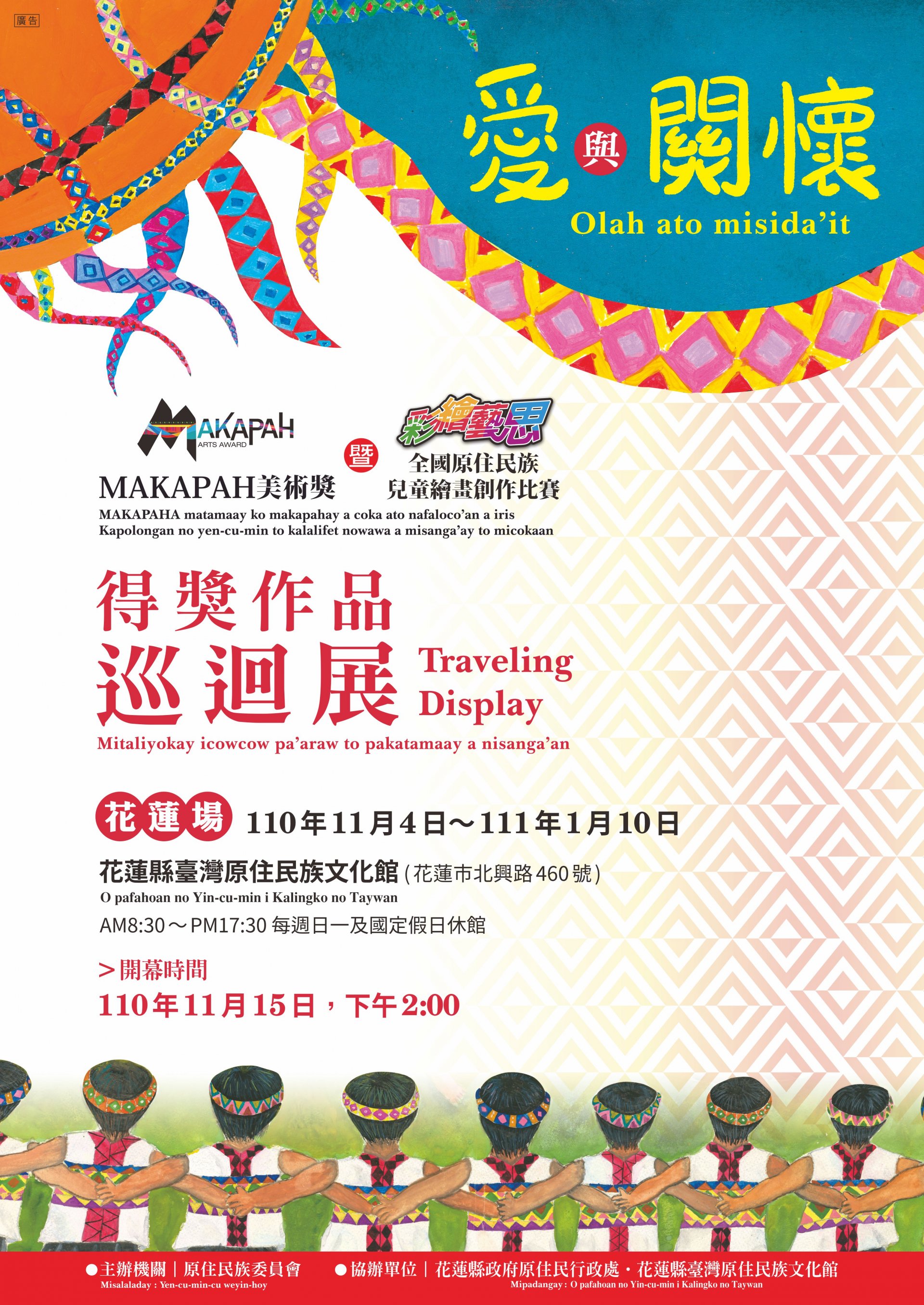 | 一、 | 旨揭策展為 MAKAPAH 美術獎歷屆前三名優秀作品繪畫類 9 幅,攝影類 42 幅及全國原住民族兒童繪畫創作比賽 第 12 、 13 屆特優獎,深具文化特色,內容多元豐富之作品 60 幅,透過作品巡迴展,促進原住民族藝術文化交流。 |