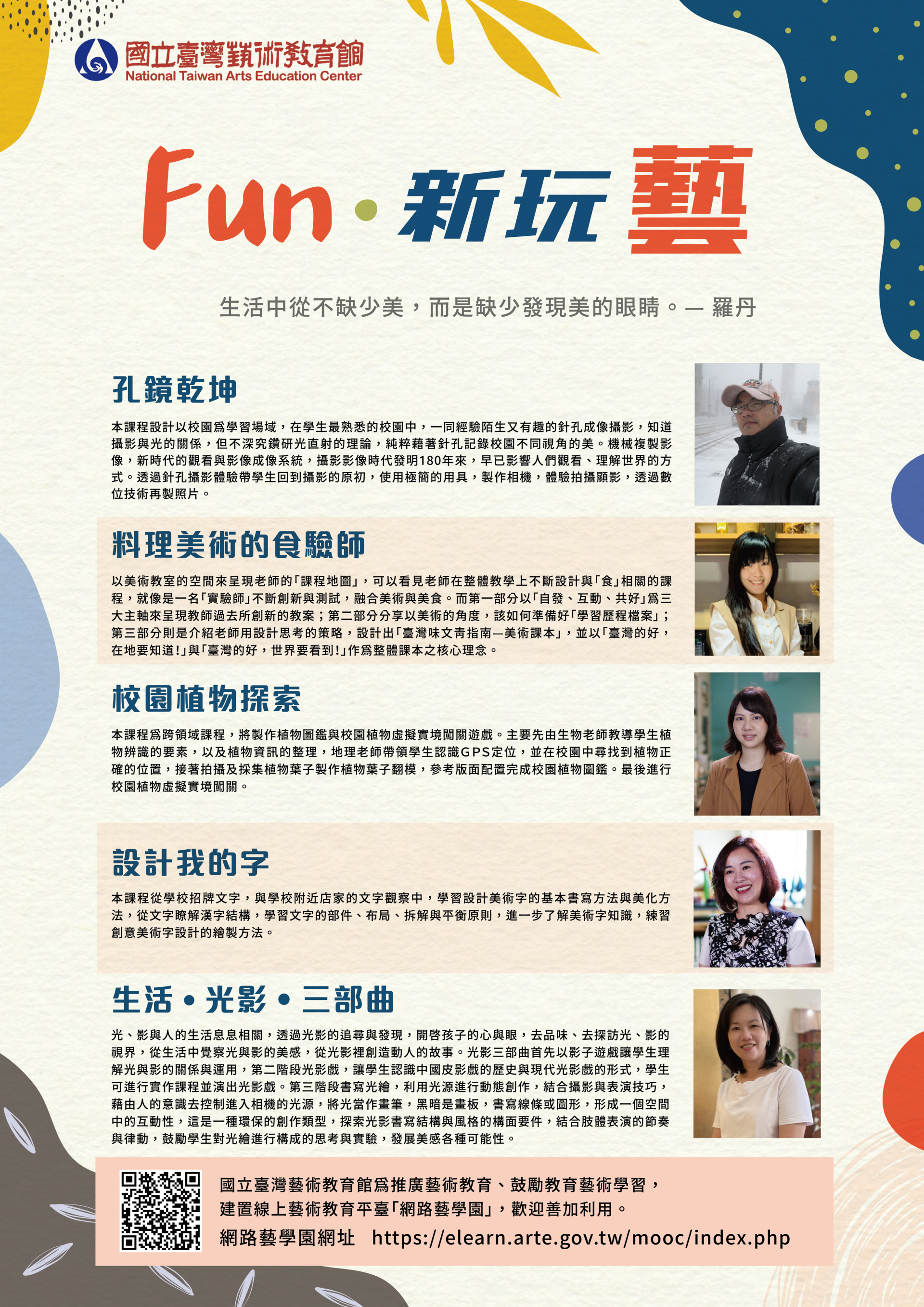 | 三、 | 111 年度新增「料理美術的食驗師」、「生活•光影•三部曲」、「設計我的字」、「校園植物探索」及「孔鏡乾坤」等 5 門數位課程,課程以跨領域思維為核心並對應十二年國教課綱。 |
