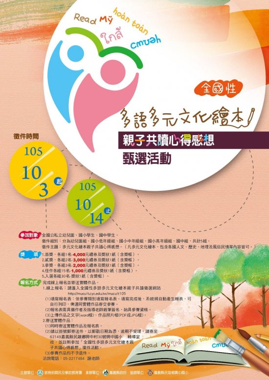 (一)線上報名:請至「全國性多語多元文化繪本親子共讀心得感想徵選網站」逕行申請帳號並登入( http://mucult.cyc.edu.tw/mucult105 )