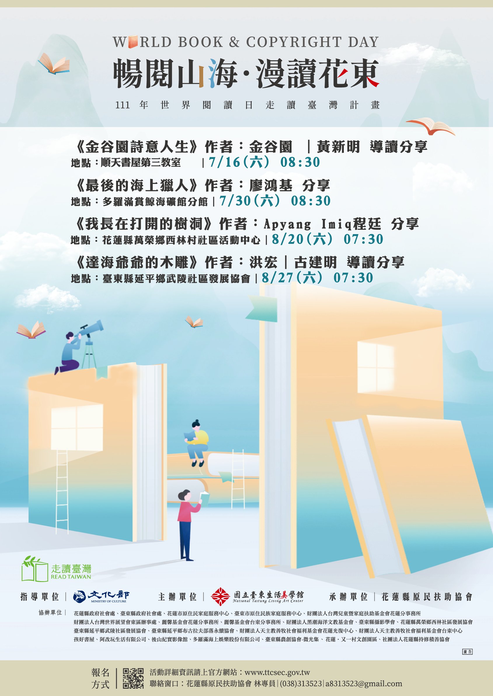 | 主旨: | 本會承辦國立臺東生活美學館辦理「111 年世界閱讀日走讀臺灣計畫-暢閱山海‧漫讀花東」活動,惠請貴單位踴躍報名及協助宣傳,詳如說明,請查照。 |