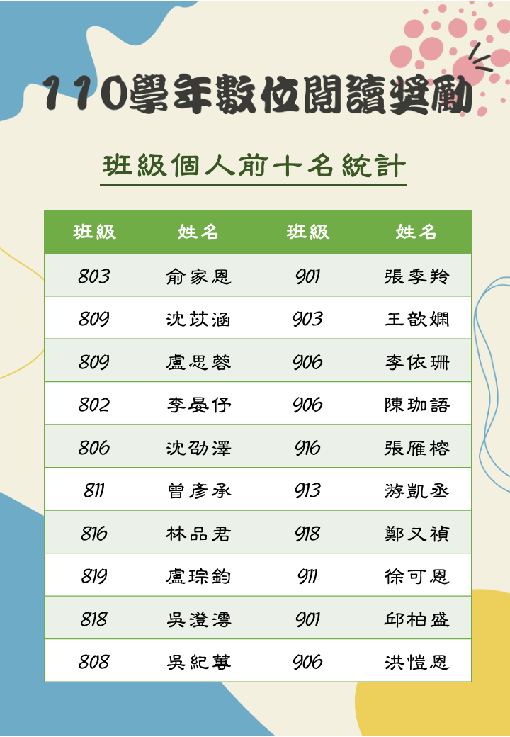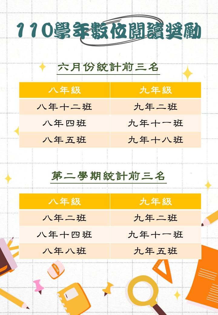 110學年數位閱讀獎勵計畫6月份優勝班級、第二學期優勝班級及個人優勝