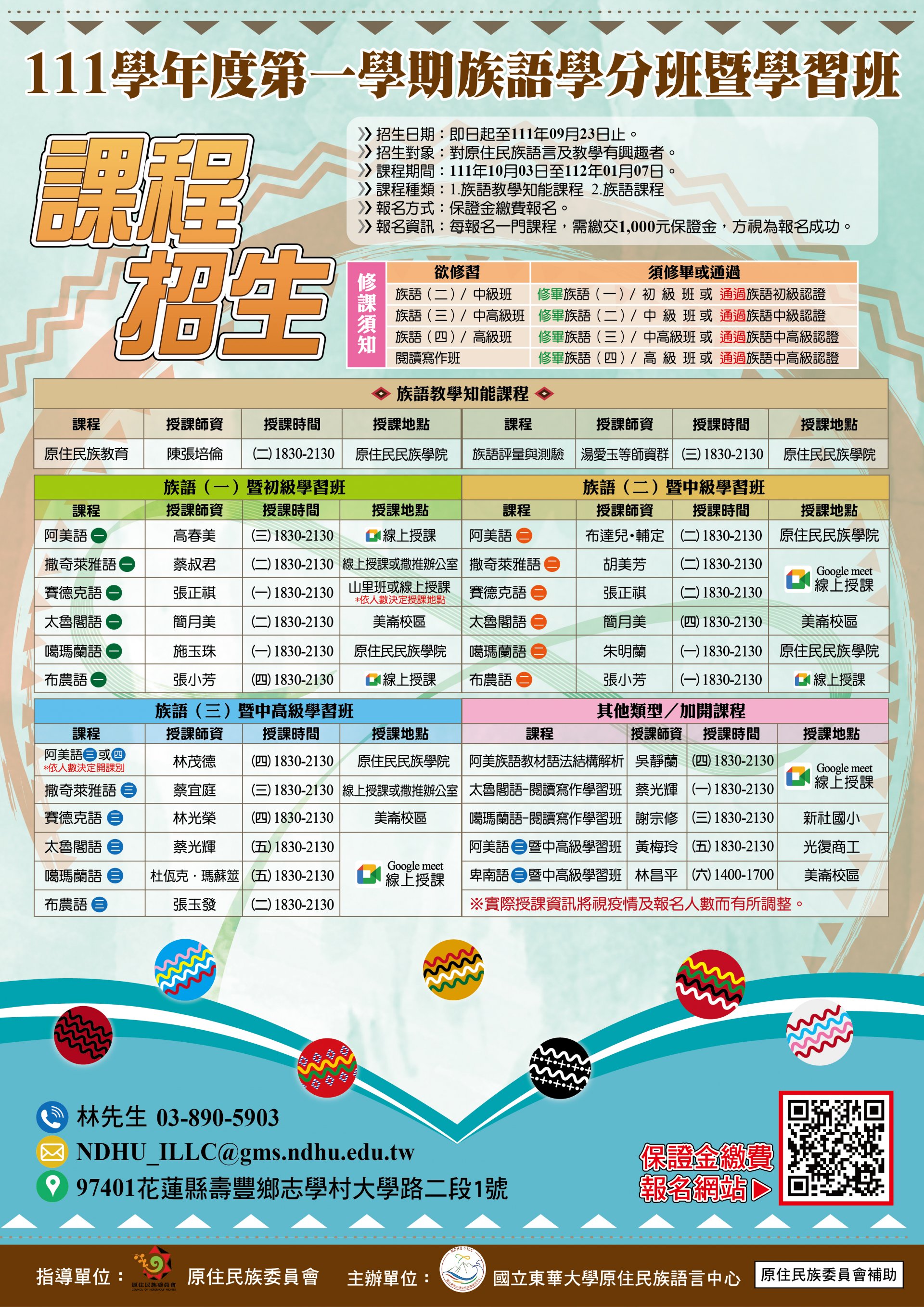 | 三、 | 旨揭「111 學年度第一學期原住民族語言學分班暨學習班」課程相關資訊詳見招生海報。 |