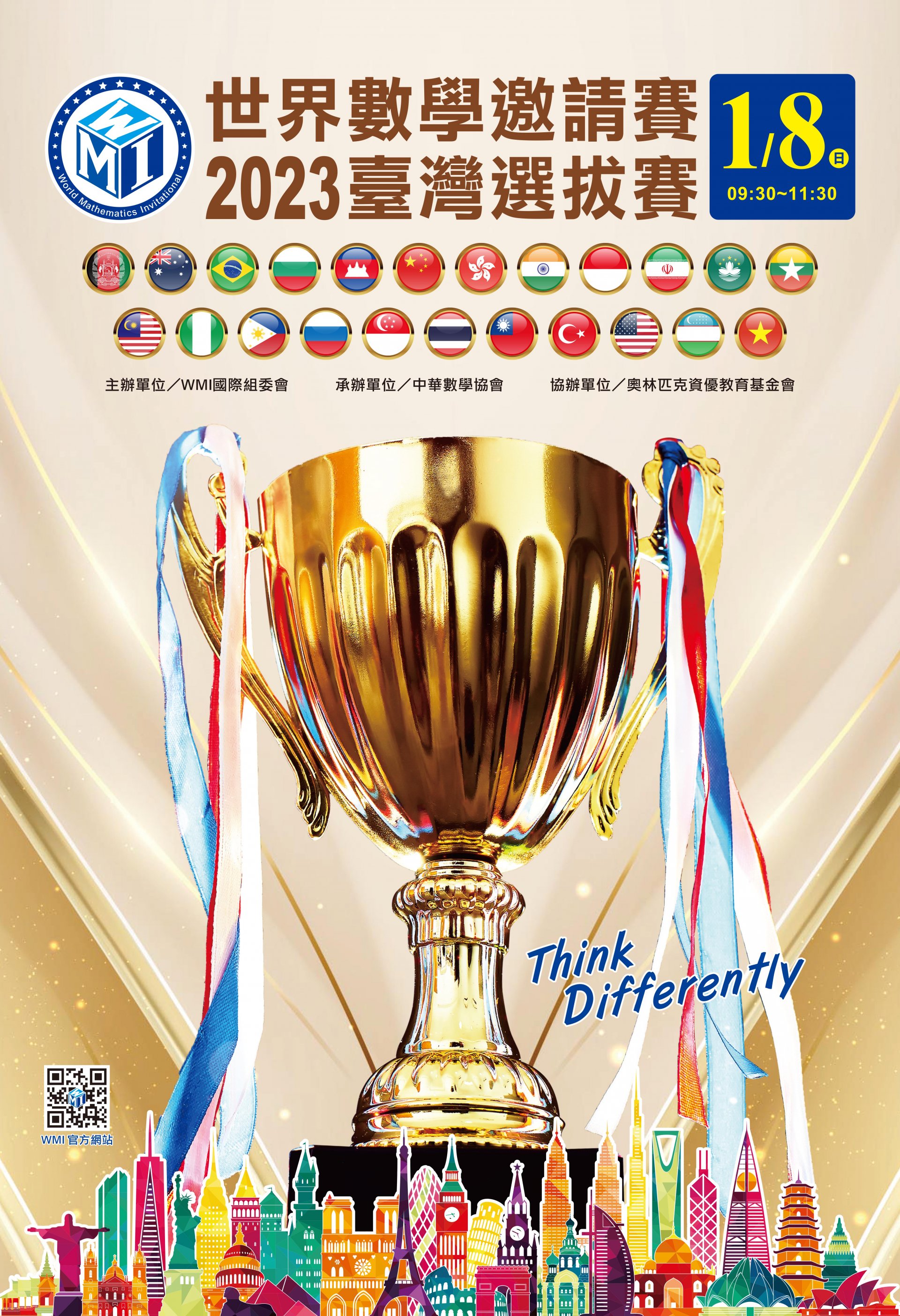 本會為推廣數學,謹訂於2023 年1 月8 日(星期日)舉辦「WMI 世界數學邀請賽-2023 臺灣選拔賽」,敬請 貴校公告並推薦學生參加競賽,以提升數學教育,歡迎共襄盛舉,與國際數學接軌,發掘優秀人才,為國爭光。請 鑒核。