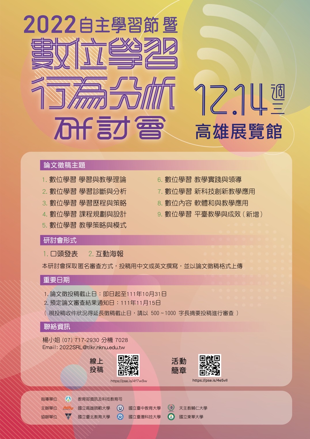| 三、 | 、本案聯絡人:楊小姐(07)717-2930 分機 7028 , Email : 2022SRL@tlkr.nknu.edu.tw 。 |
