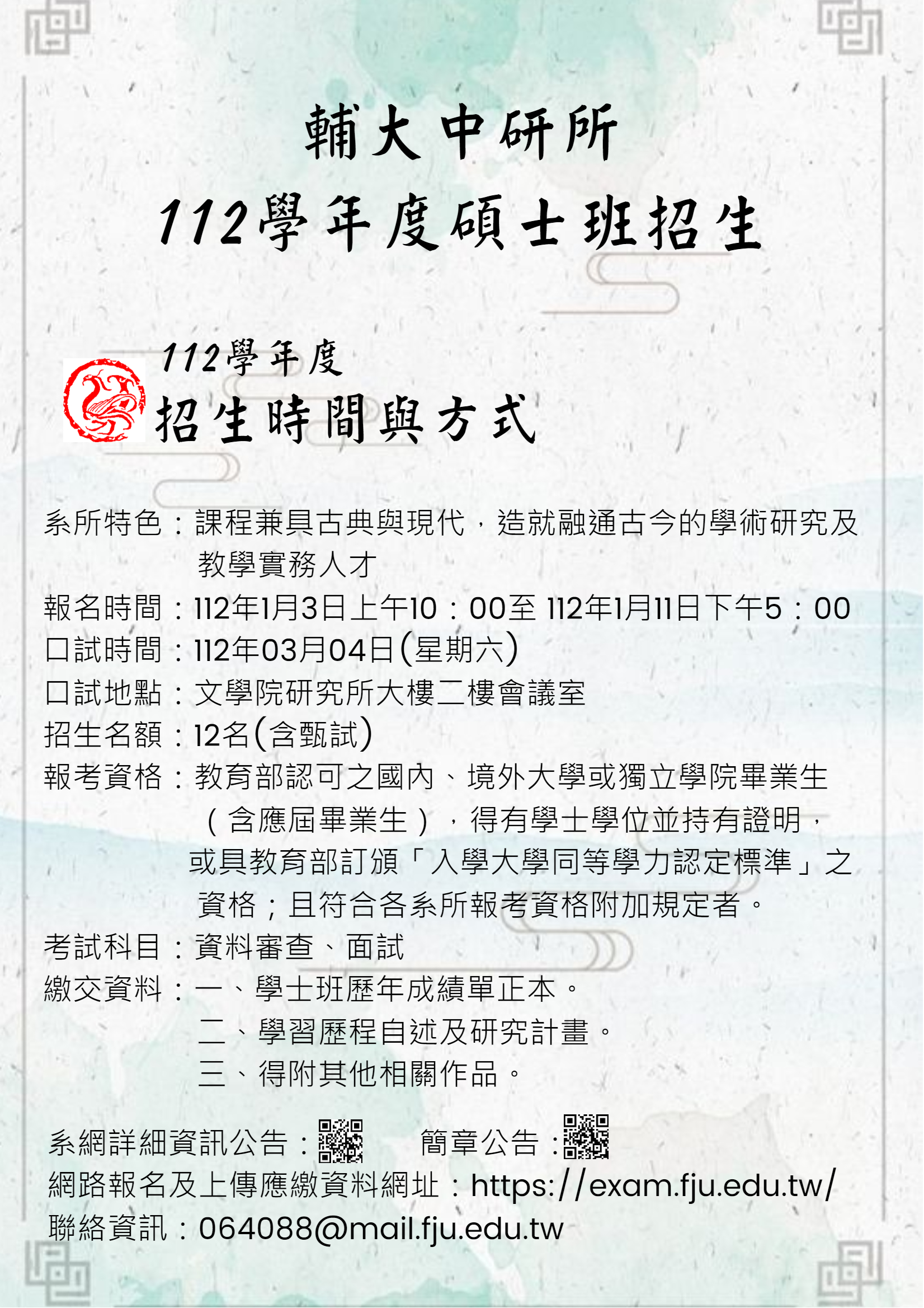 輔仁大學中國文學系研究所碩士班112學年度招生簡章、海報等各乙份。