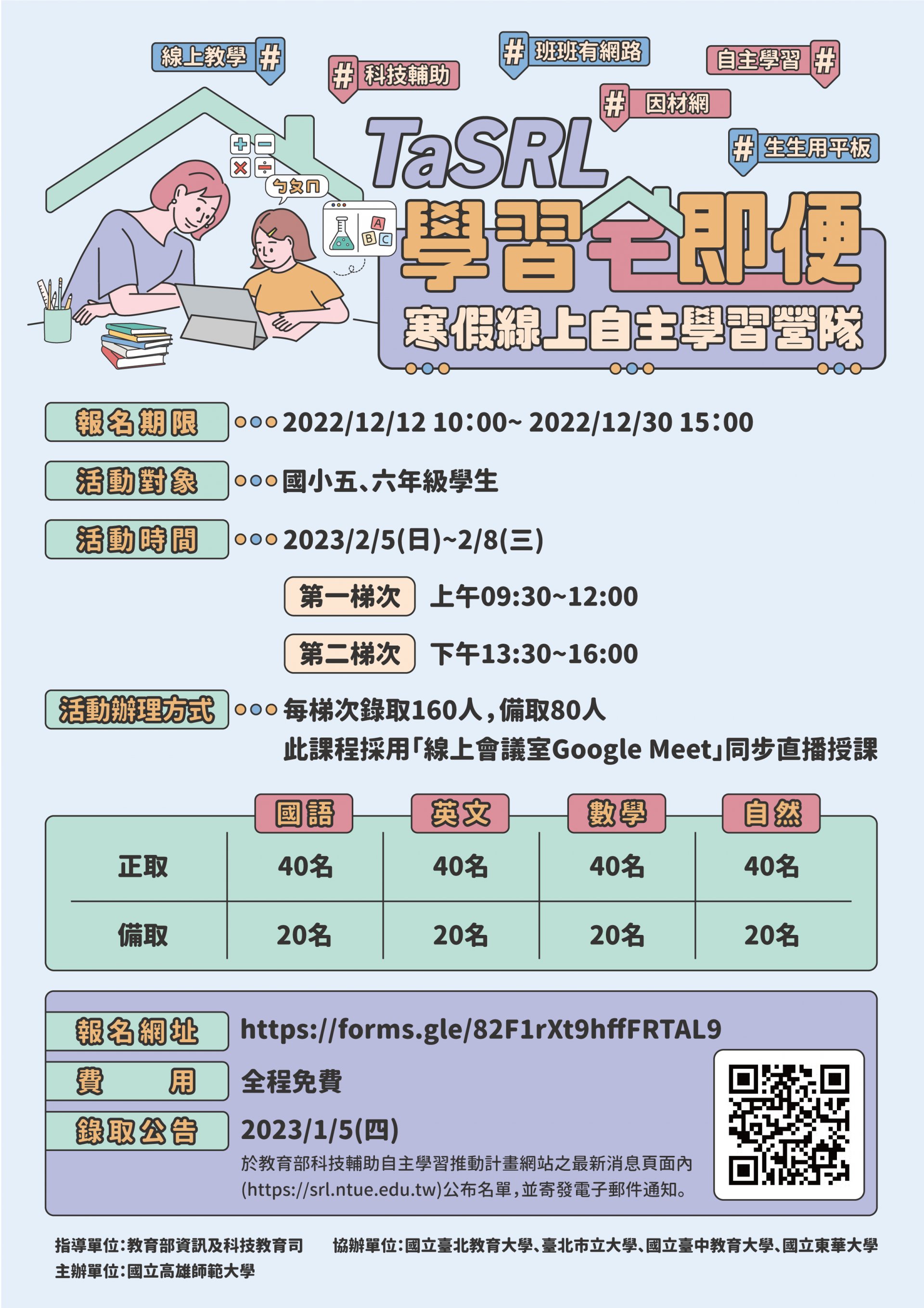 | 八、 | 錄取公告:於教育部科技輔助自主學習推動計畫網站之最新消息頁面內( https://srl.ntue.edu.tw )公布名單,並寄發電子郵件通知。 |