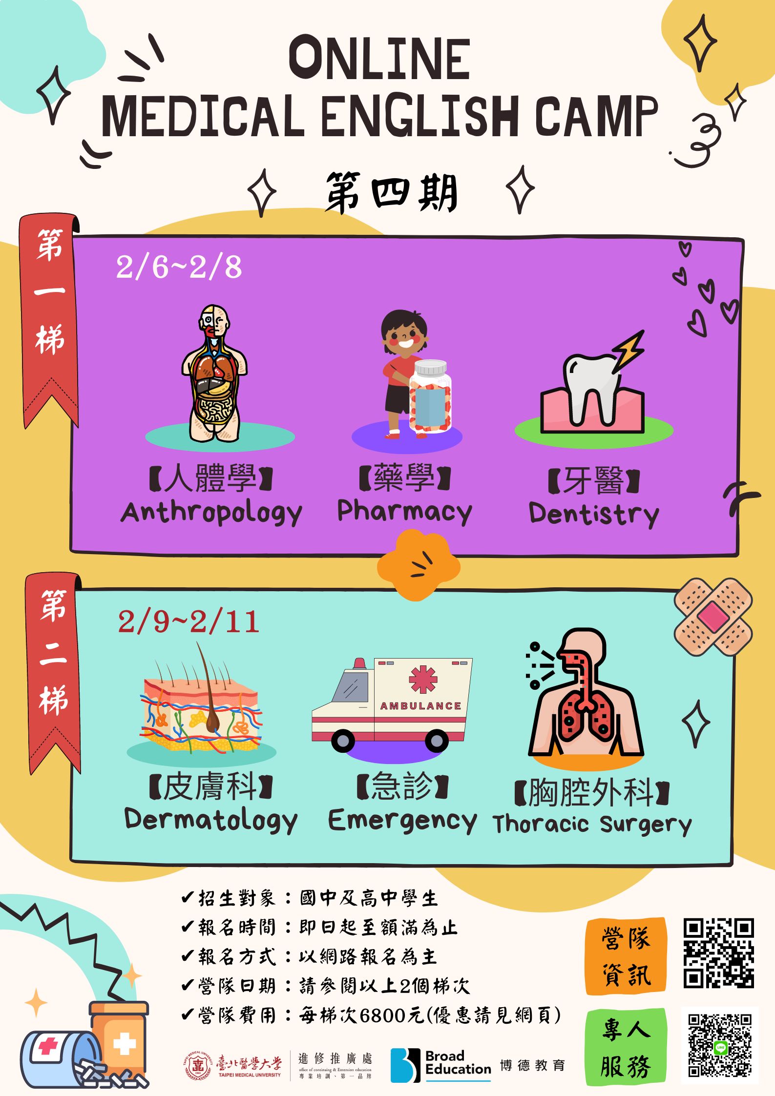 | 一、 | 本校結合北醫專業醫療師資、國際師資、國際外師及醫學生的資源,創造英語的環境,讓同學們能藉由營隊期間的各種課程與活動啟發對於醫學領域的興趣,延展對未來職涯探索的新領域。營隊將於 112 年 2 月 6 日至 112 年 2 月 11 日期間辦理「線上英文醫學營第 4 期」,總共預定辦理 2 個梯次的營隊,分別為第 1 梯 2/6-2/8 、第 2 梯 2/9~2/11 ,惠請貴單位協助轉發,並歡迎共襄盛舉。 |