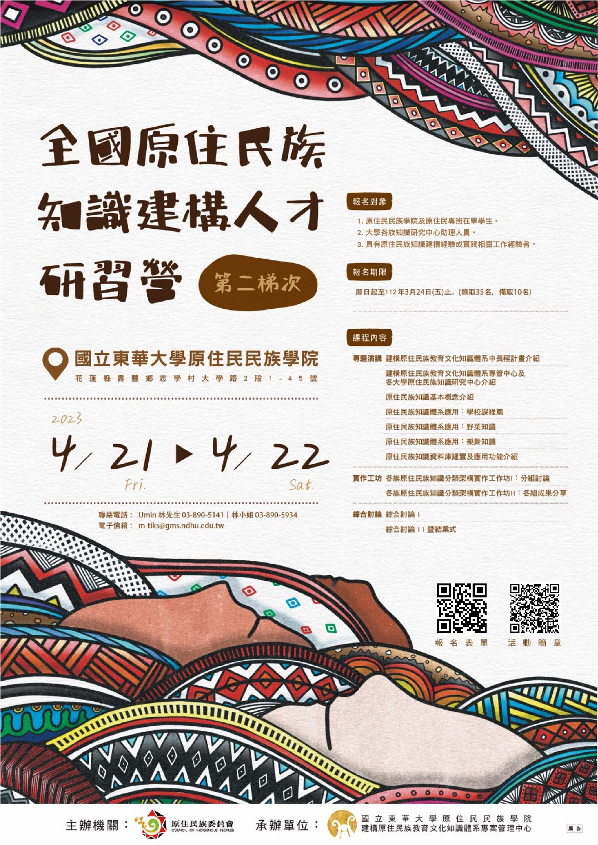 | (二) | 活動地點:東華大學原住民族學院 (花蓮縣壽豐鄉志學村大學路二段 1-45 號)。 |