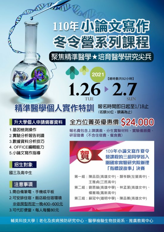| 一、 | 本校訂於110年1月26日至110年2月7日辦理「小論文寫作寒令營系列課程」,開課資訊詳如簡章說明,即日起開始報名。 |