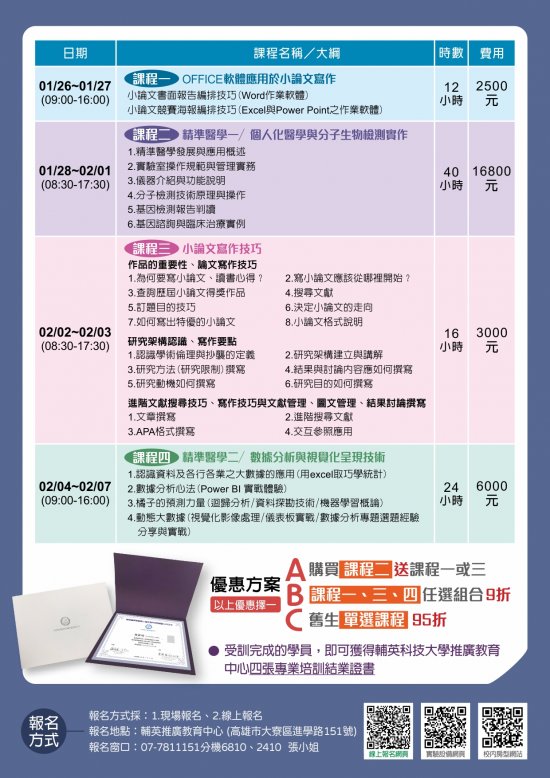 | (一) | 現場報名-至本校推廣教育中心繳交報名表、2吋大頭照4張、身分證正反面影本及課程費用。 |