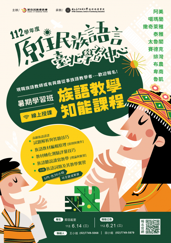 三、 旨案招生對象針對有意從事阿美族、噶瑪蘭族、撒奇萊雅族、泰雅族、太魯閣族、賽德克族、排灣族、布農族、卑南族、魯凱族等族語教學或語言推動工作者。
