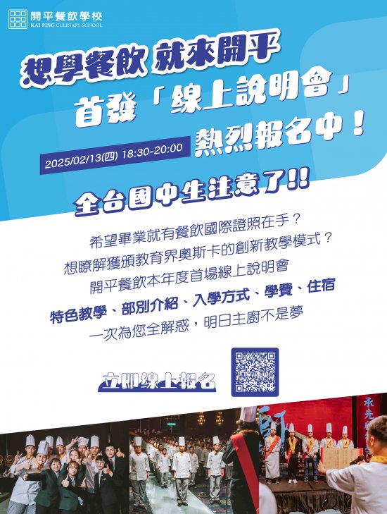 | 一、 | 為使更多國中學生對技職教育深入瞭解,本校並辦理「線上理念說明會」,提供學生、家長認識本校教育理念與餐飲教學特色,協助增進國中學生及其家長對職業類科升學管道及學習內容之試探,期望開平優秀學子成為臺灣及國際餐飲界之人才。 |