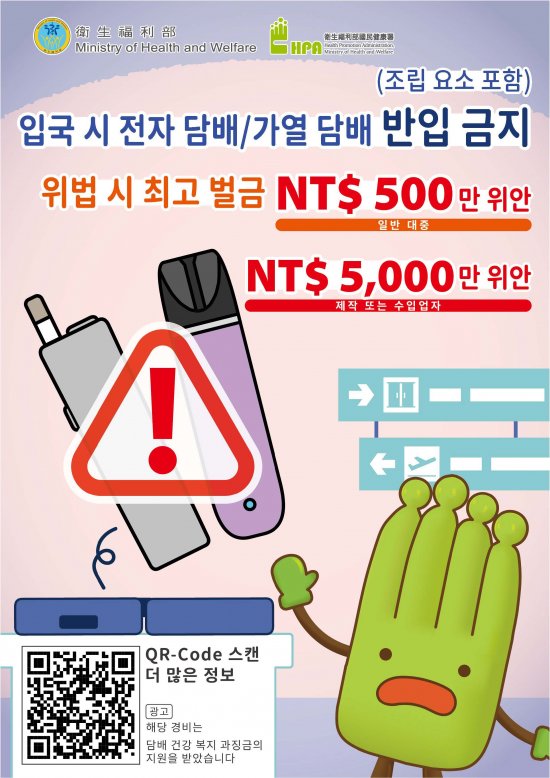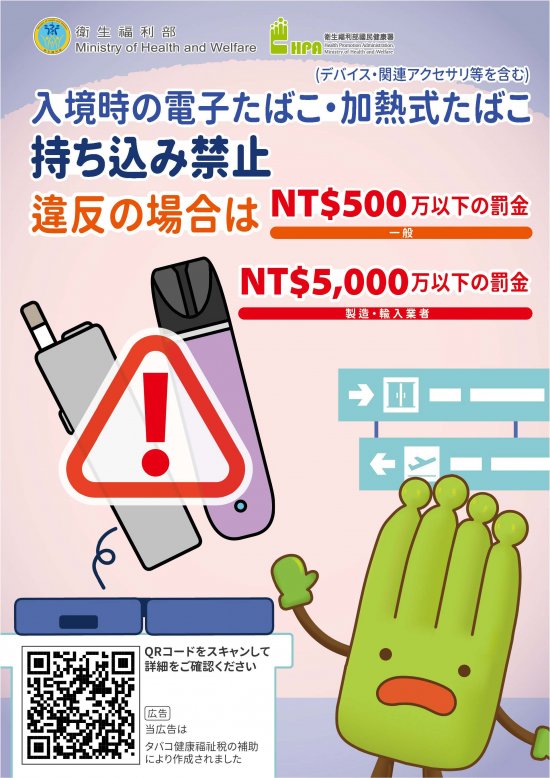 三、    衛生福利部為強化非本國籍入境旅客之宣導,已製作完成「禁止攜帶電子煙或加熱菸入境」之英日韓三國語言版本宣導單(如附件),請向教職員工生宣傳周知,並請協助刊掛電視牆、佈告欄。