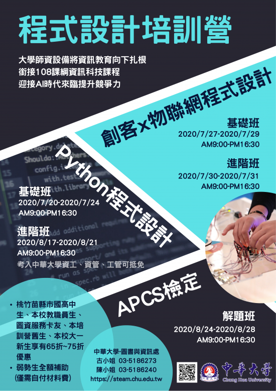 | 一、 | 旨揭中華大學「程式設計培訓營」共五門課程,旨在讓國小高年級生、國中生與高中生可以順利銜接108課綱資訊科技領域必修的程式設計課程,培養學生運用程式設計解決問題的能力,有助於提升學生於數位時代之競爭力。 |