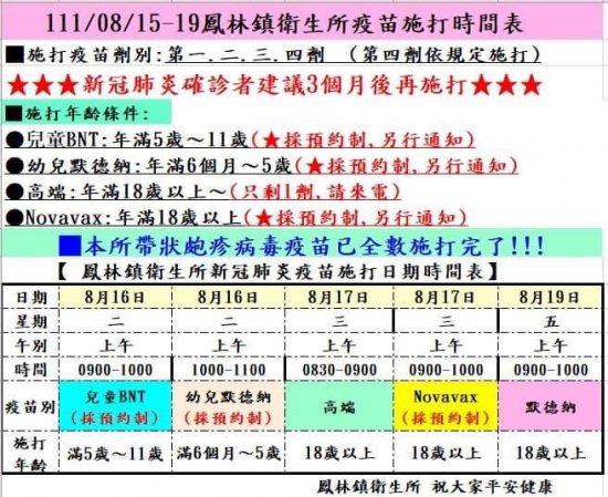附圖為111/08/15-08/19鳳林鎮衛生所疫苗施打時間表,如欲預約施打疫苗,請撥電話至鳳林衛生所預約鳳林鎮衛生所電話:03-8761116