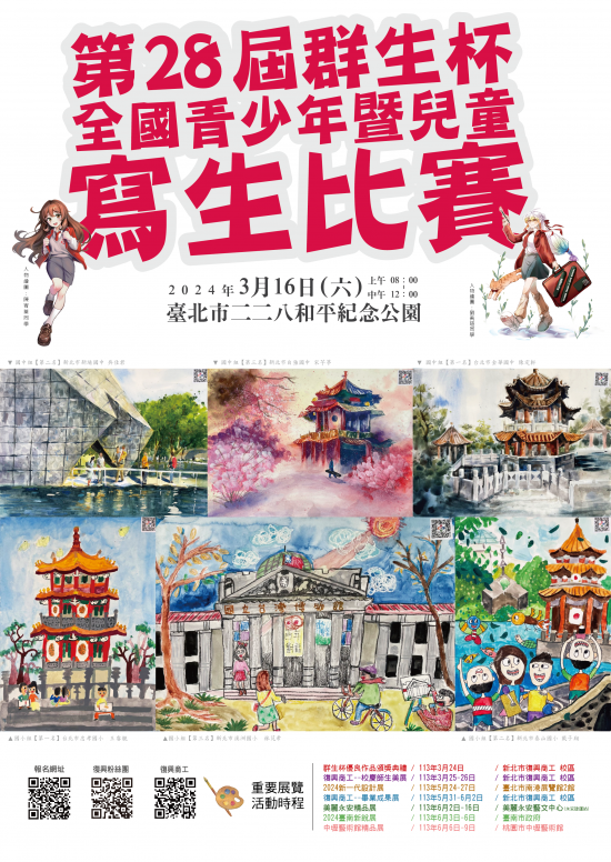 三、比賽方式:採現場寫生方式,題材以二二八和平公園建築及庭園景觀為主,比賽用四開畫紙由本會提供,用具一律自備,採用任何描繪工具、材料皆可,表現形式不拘,並不得自備紙張或由他人代筆、修改,違者取消資格。