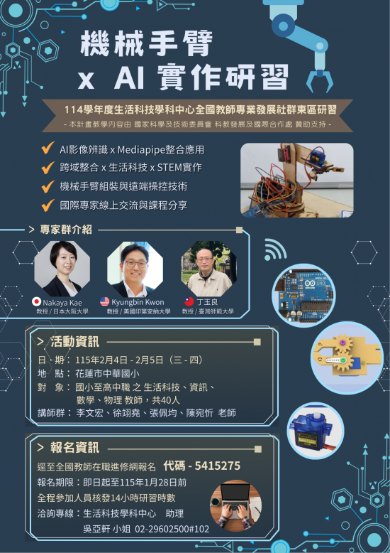 附件: 生活科技學科中心全國教師專業發展社群東區研習計畫書、2026020405機械手臂 (376550000A_1140260338_ATTACH1.pdf、376550000A_1140260338_ATTACH2.png)