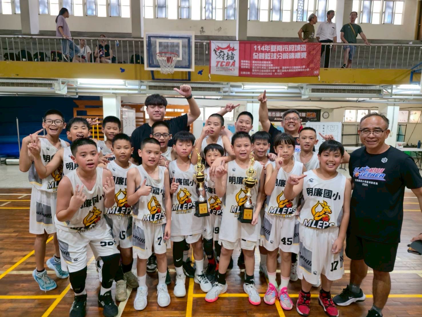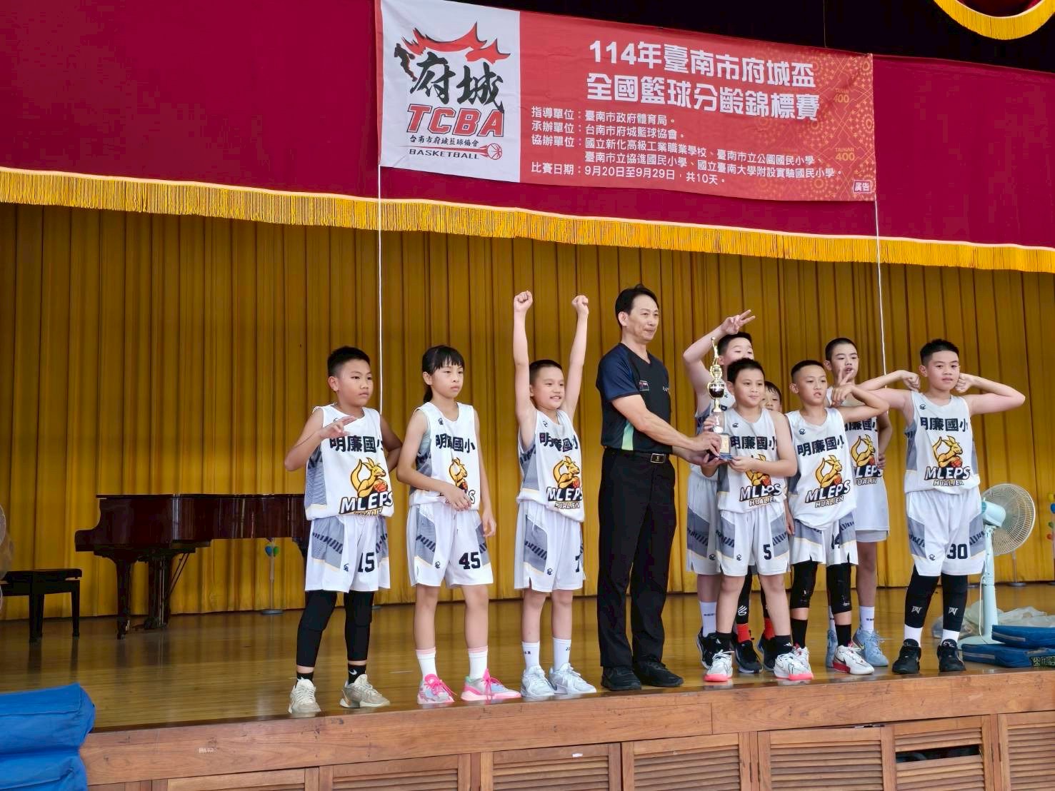 狂賀籃球隊榮獲114年台南市府城盃全國籃球分齡錦標賽國小五年級組六年級組雙料冠軍,感謝十六位參賽選手及指導教練:李品亨師、吳其洲師、繞俊雄先生的辛勤與付出!