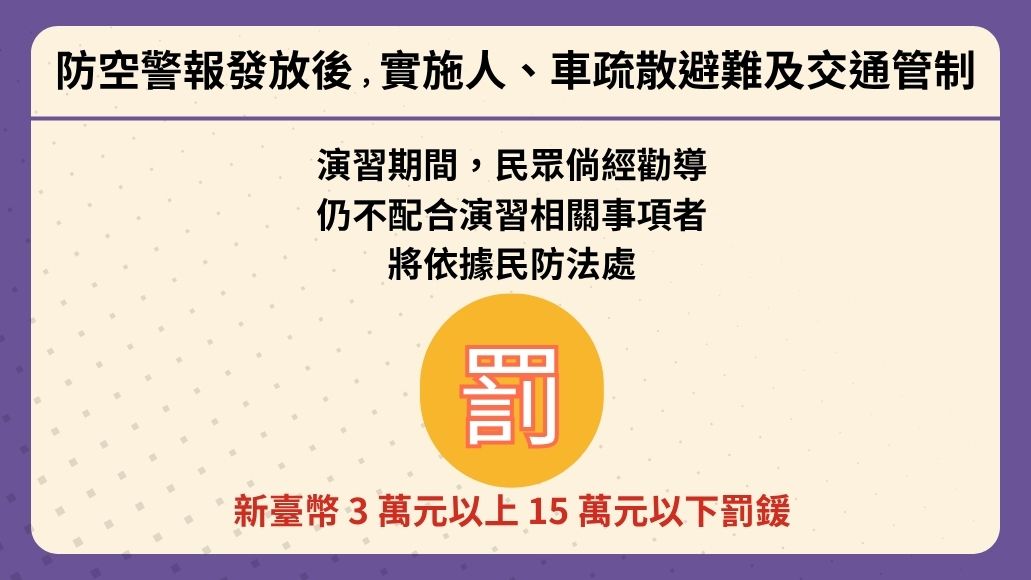 (一)防空警報發放後實施人、車疏散避難及交通管制。