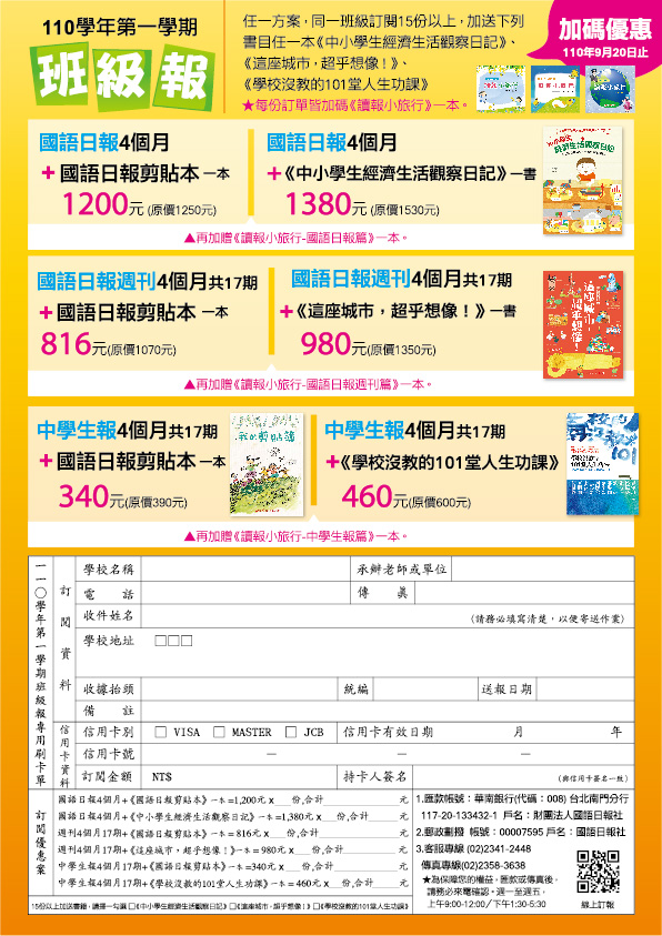 本社即日起推出「110-1 學期班級報」優惠訂閱專案,此案訂閱期間為 4 個月。