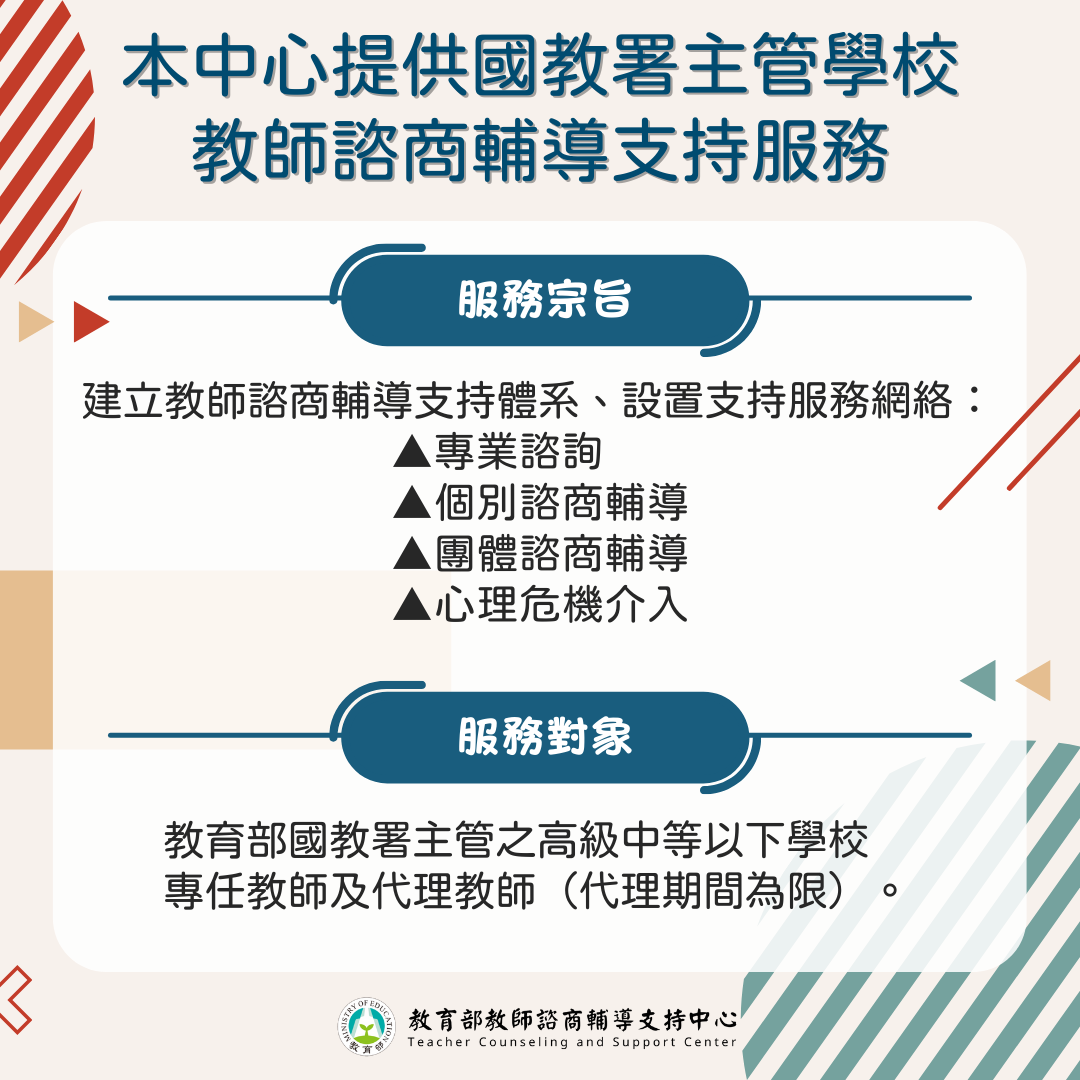 一、中心服務宗旨:「提供國教署主管學校教師諮商輔導支持服務。」
