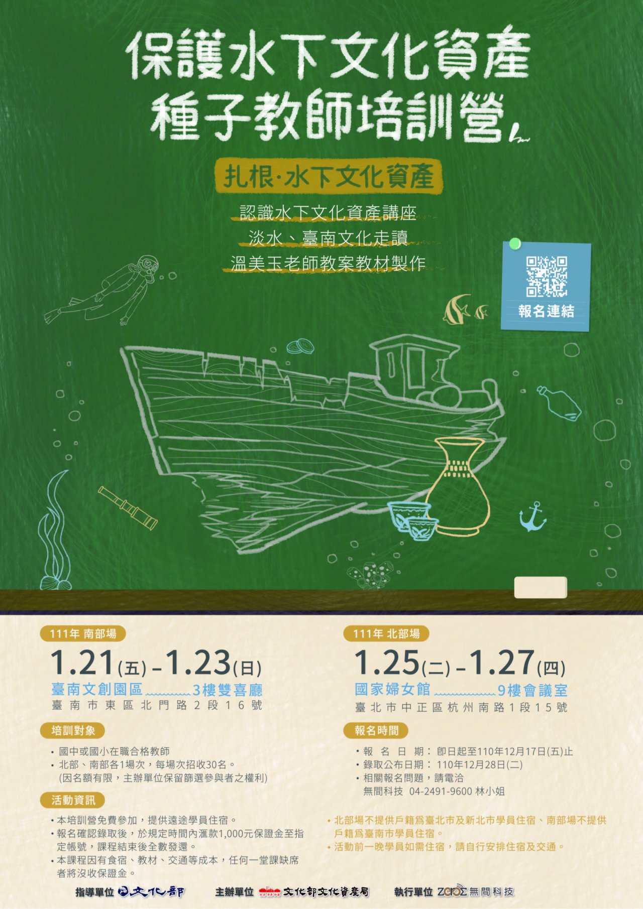轉知教育部函轉文化部文化資產局辦理南、北二場「保護水下文化資產種子教師培訓營」簡章,請教師踴躍報名參加。