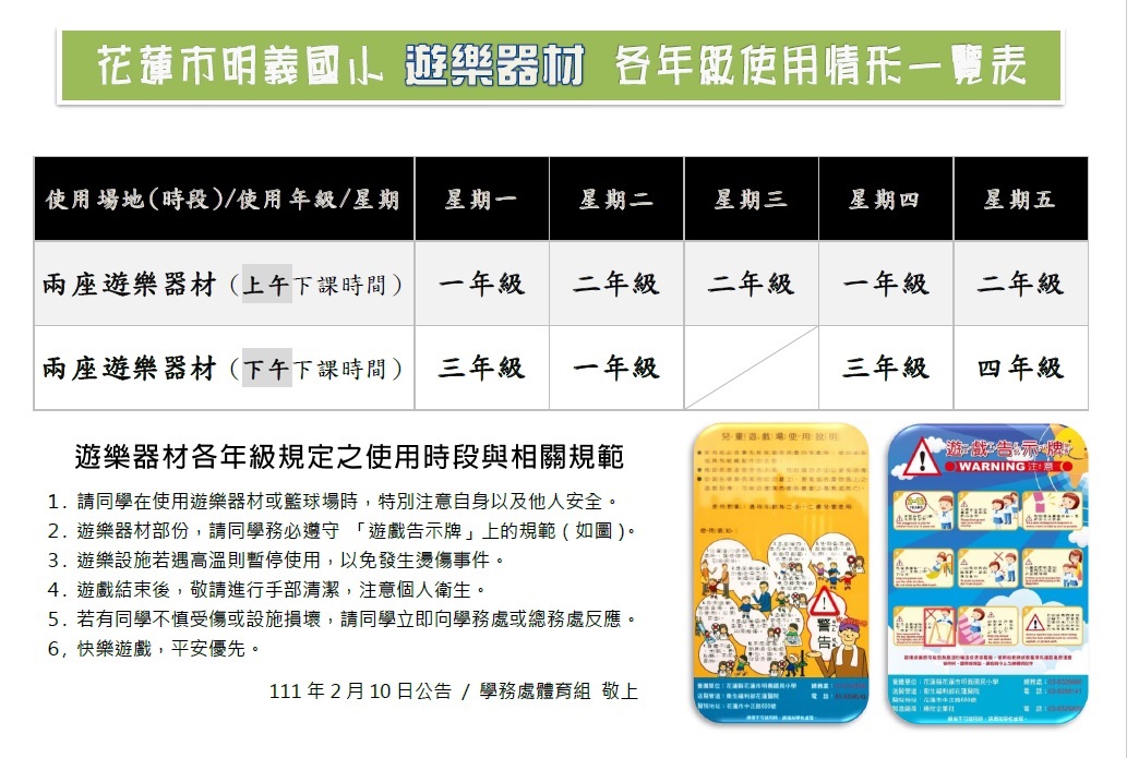 1. 請同學在使用遊樂器材或籃球場時,特別注意自身以及他人安全。