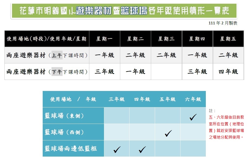 遊樂器材或籃球場各年級規定之使用時段與相關規範,